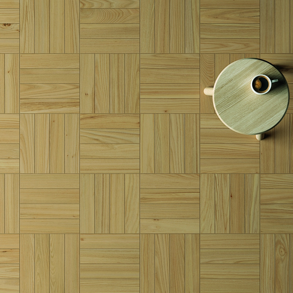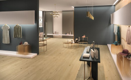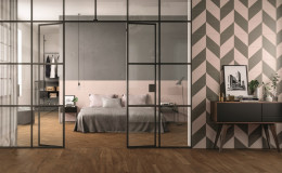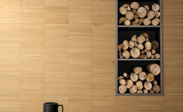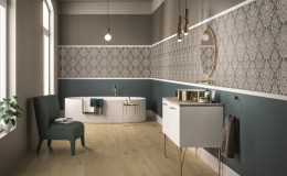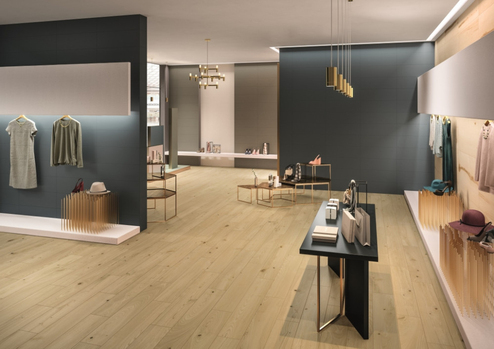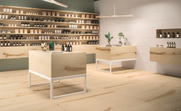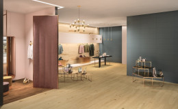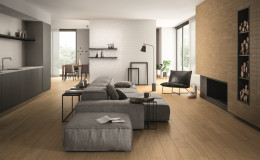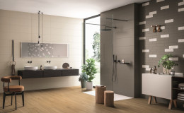 Теплый обволакивающий эффект древесины на полу в сочетании с однотонными керамическими плитками на стенах с эффектом нежных мазков на шелковой поверхности, создает оригинальные цветовые комбинации. Идеальные материалы для новой эстетики как в жилых, так и в коммерческих помещениях