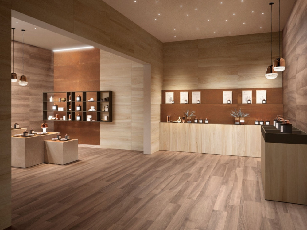 Керамогранит под дерево Maison представлен в цветах Хани, Шампейн, Фуме, Бренди и Волнат. Богатая гамма светлых и темных тонов, наряду с тремя форматами, 30x120, 20x120 и 15x120, позволяет естественно оформлять как домашние, так и общественные интерьеры.